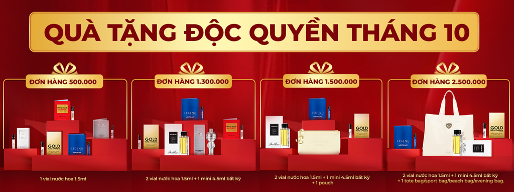 - Đơn hàng từ 2 triệu: Tặng 2 vial nước hoa 1.5ml + 1 tote bag/sport bag/beach bag/evening bag + 1 mini nước hoa/mini makeup/skincare 4.5ml bất kỳ.