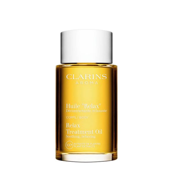 Tinh dầu massage thư giãn cơ thể Clarins Relax Body Treatment Oil chứa 100% chiết xuất thực vật tự nhiên mang đến chức năng trị liệu, thư giãn, giảm mệt mỏi và cung cấp độ ẩm cần thiết cho da, xoa dịu cơ thể sau khi tập thể dục, vận động nhiều.