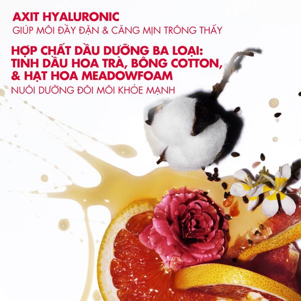 Công thức giàu dưỡng chất từ dầu hoa trà, bông vải và hạt hoa meadowfoam giúp môi mềm mượt theo thời gian, mang lại vẻ ngoài tươi tắn, căng tràn suốt cả ngày.